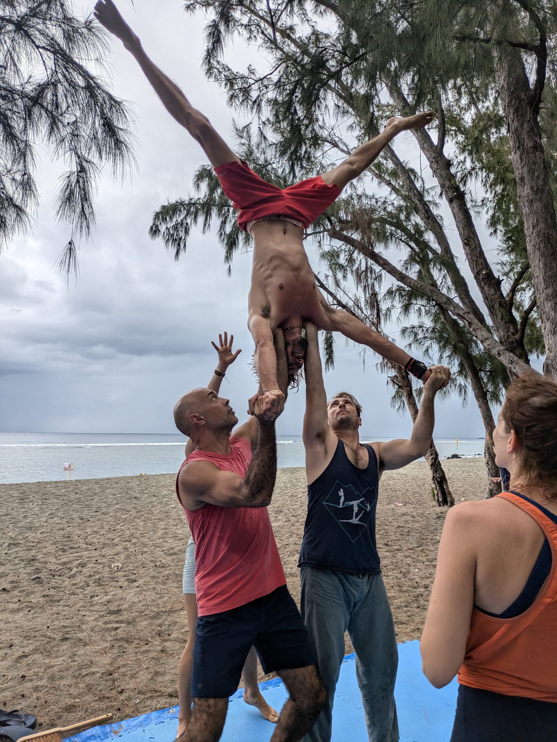 L’acroyoga est pour nous une discipline qui rassemble et qui permet de slélever mutuellement par le jeu et l’entraide.